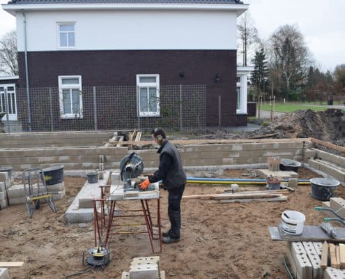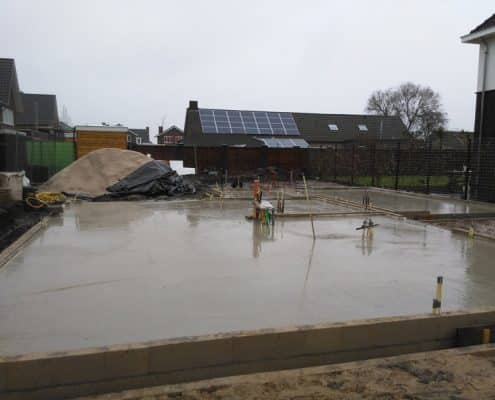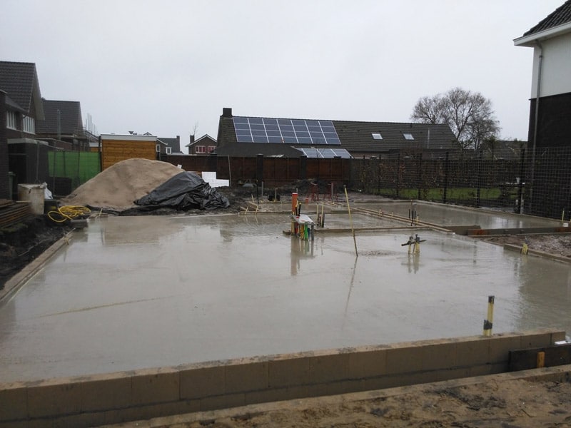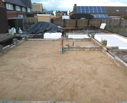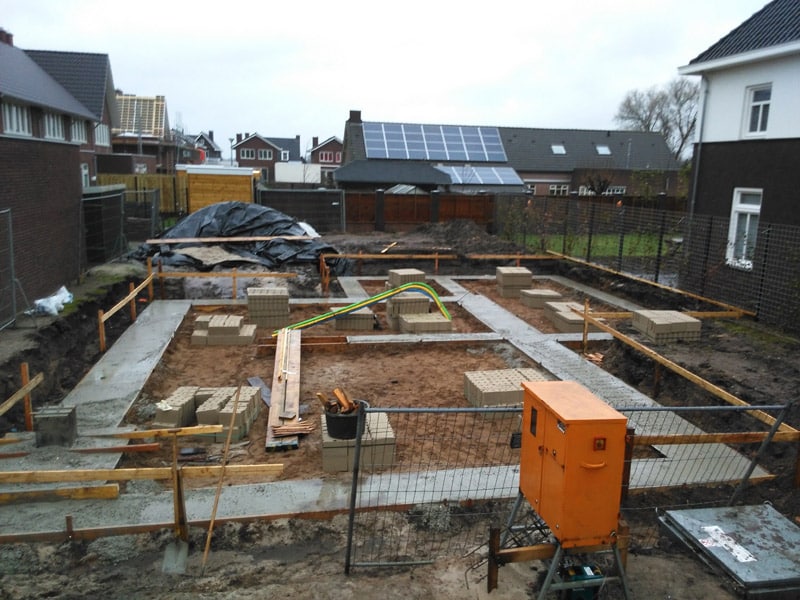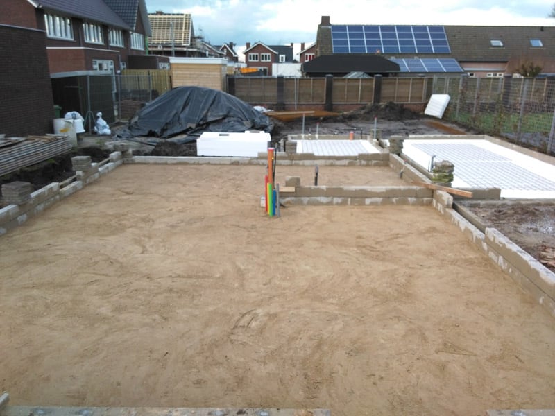 Het starten van de bouw begint met het grondwerk. Het uitzetten van het raamwerk en de bekisting. Het uitgraven en het het storten van de fundering. Voor het storten van de begane grond vloer wordt er isolatie aangebracht en afgevuld met geel zand. Na dit afvullen volgt er nog een laag isolatie.
