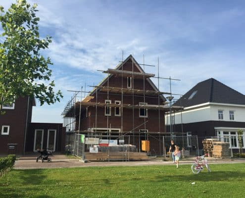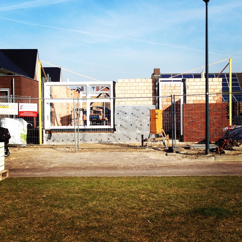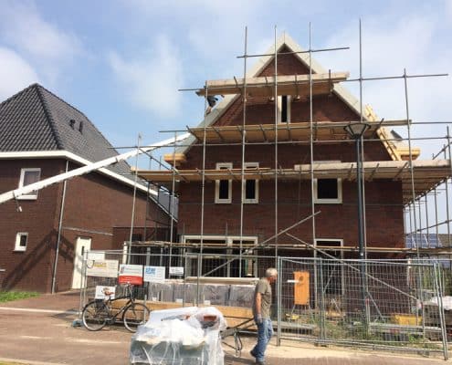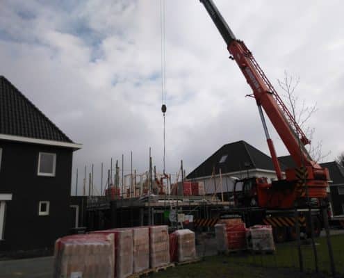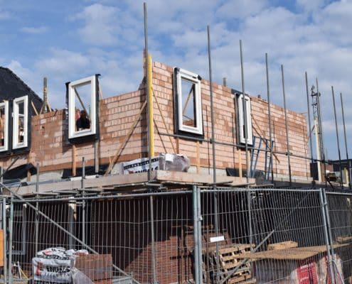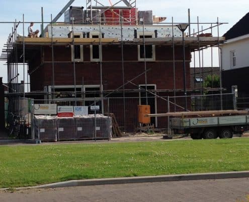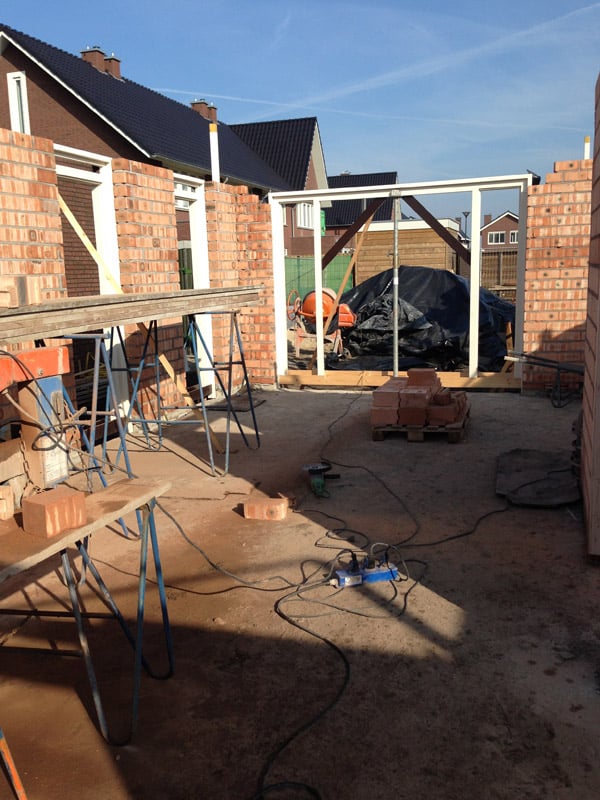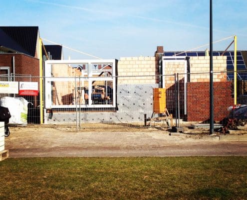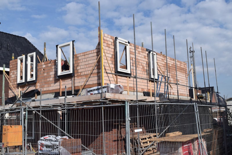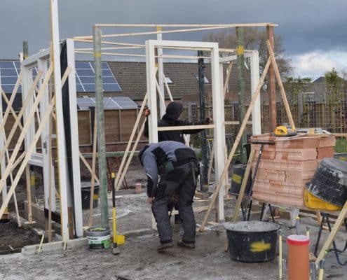 We starten met het stelwerk. Mooi deel van de bouw. Je ziet meteen de vorm van de woning. Het stelwerk is later belangrijk voor het metselwerk. Ook kozijnen worden meteen geplaatst.