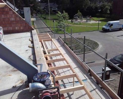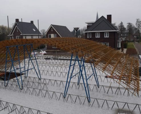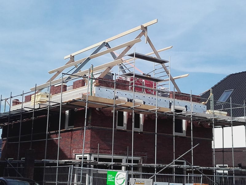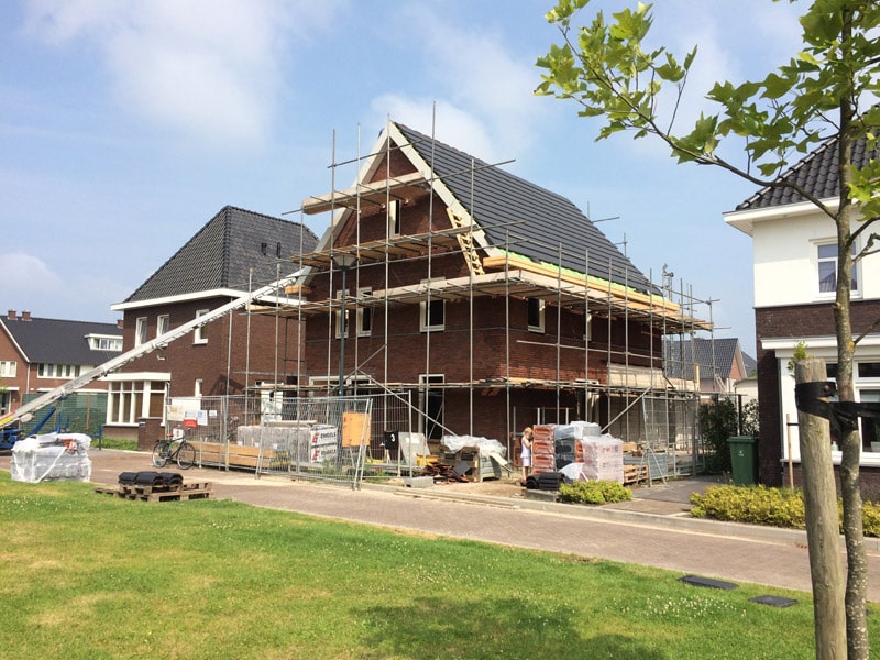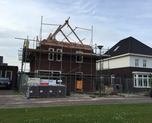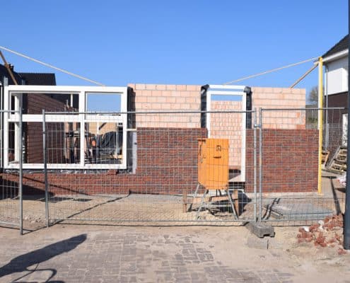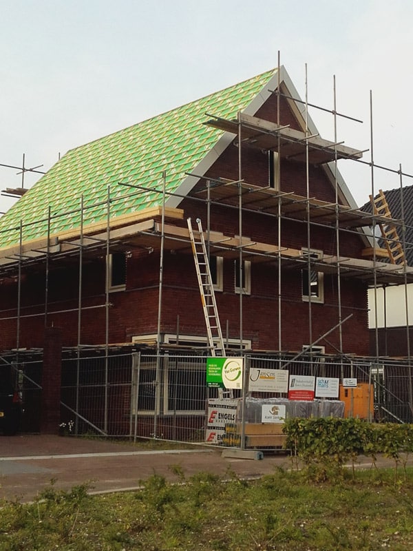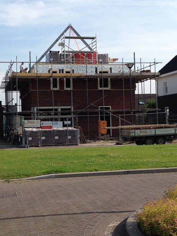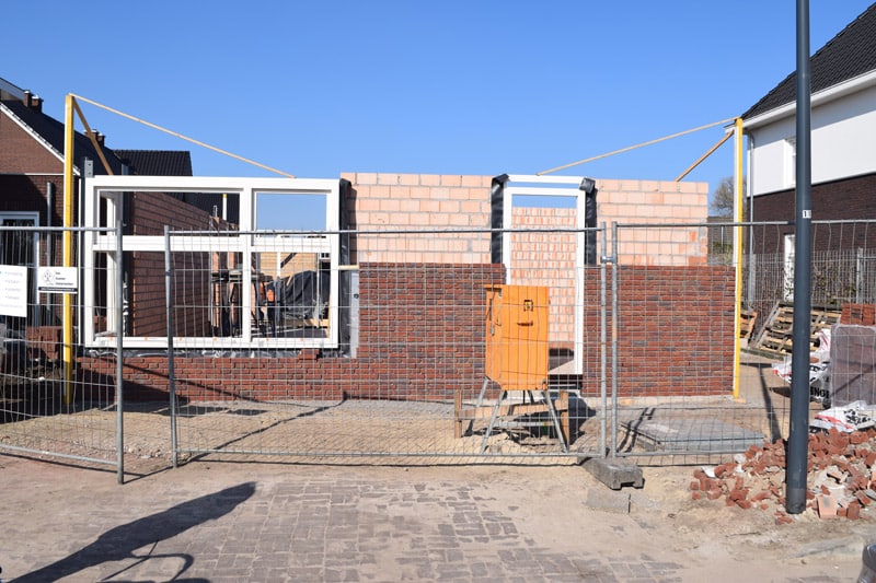 We starten met het stelwerk. Mooi deel van de bouw. Je ziet meteen de vorm van de woning. Het stelwerk is later belangrijk voor het metselwerk. Ook kozijnen worden meteen geplaatst.