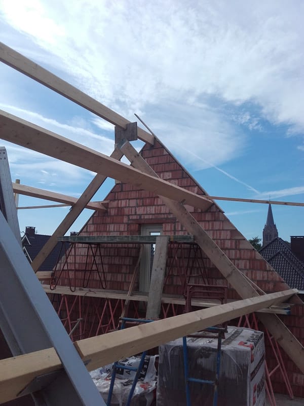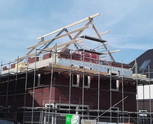 Het laatste metselwerk van de buitenmuur wordt geplaatst. De houten balken worden op de spanten geplaatst en de woning wordt voorzien van een dakgoot. Het krijgt nu echt vorm en je kan de stijl van de woning al helemaal zien.
