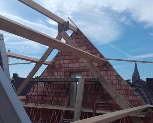 Hierna gaan we metselen. We gebruiken Poriso stenen voor. De buitenmuur wordt deels ook meteen gemetseld en voorzien van isolatie materiaal. Wanneer de Poriso stenen de hoogte van het dak hebben bereikt worden de dakspanten geplaatst. We zitten nu al snel op het hoogste punt van het huis.
