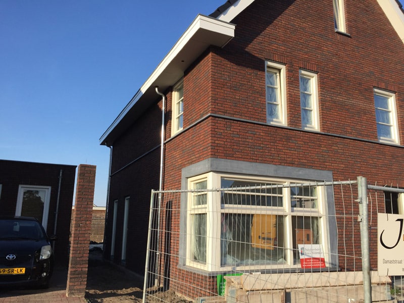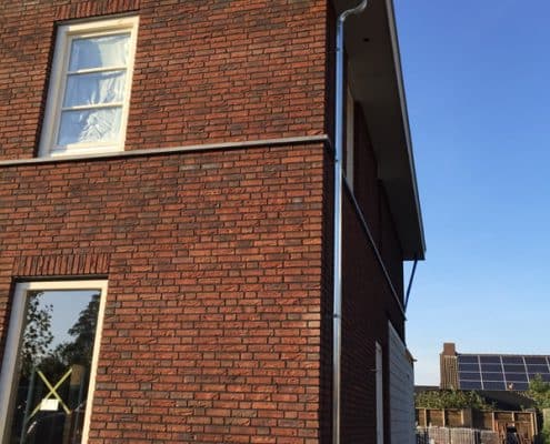 Het hoekraam wordt voorzien van hardsteen. Dit past heel mooi in de stijl en maakt het helemaal af. Ook de afvoerbuizen worden geplaatst. Nu is het huis gereed en kunnen de nieuwe bewoners starten met het afwerken van de binnenzijde. Ons werk zit er op. Maar het resultaat mag er wezen. Een project om trots op te zijn.