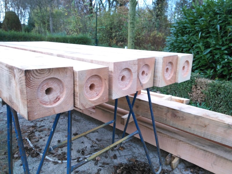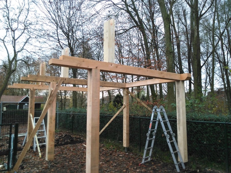We starten met het infrezen van de balken die op de grondankers komen. Deze houden we van de grond af ivm optrekkend vocht. Hierna bouwen we de rest van de balkenconstructie op.