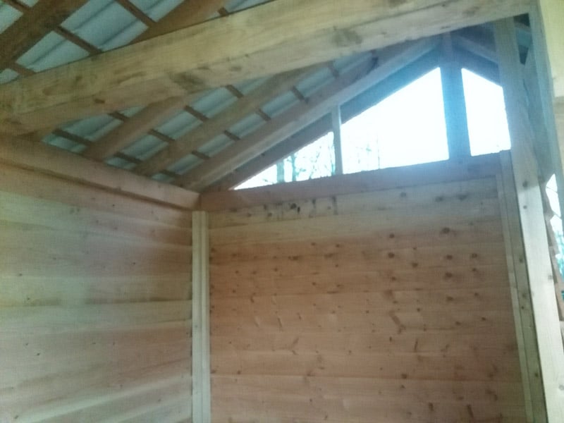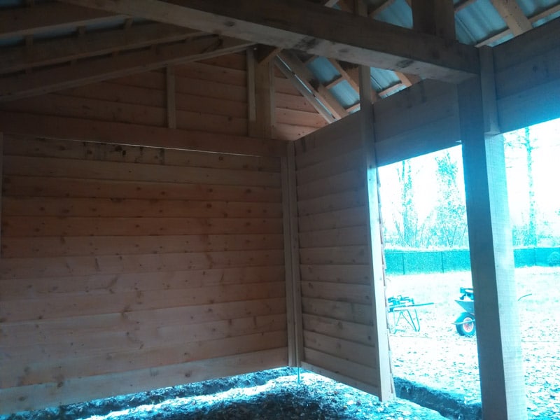 En dan nu het aftimmeren. Het is belangrijk dat de dieren droog staan en uit de wind. Maar er mag zeker wel genoeg ventilatie zijn. Dus de inloop blijft open en ook de overstek wordt niet afgetimmerd. Mooie plek voor de lama’s om te schuilen.